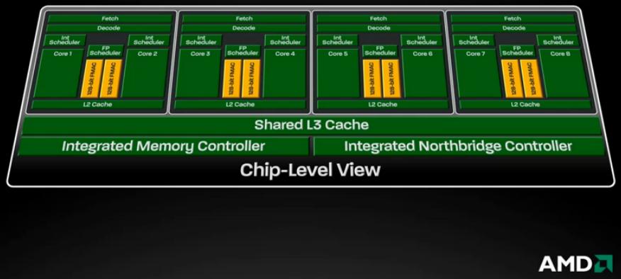 Desse modo, processadores quad-core trarão dois módulos internos, cada qual com dois núcleos, ou seja, cada par de núcleos compartilhará alguns recursos. Assim também acontecerá com CPUs de oito núcleos, as quais terão quatro módulos (como essa mostrada acima). A AMD informa que essa nova estrutura interna foi adotada para melhorar o desempenho e reduzir custos.