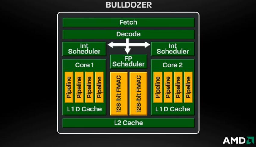 Como já citamos, a AMD decidiu reestruturar a arquitetura de seus processadores. Isso significa que o posicionamento das peças dentro das CPUs foi alterado. Os Bulldozers trabalharão com módulos, sendo que cada um terá dois núcleos. Esses módulos compartilharão alguns recursos, como o Fetch (unidade que recebe os dados), o Decode (unidade de decodificação) e a memória L2.