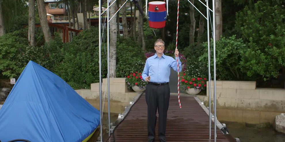 Em seu vídeo, Bill Gates não deixou por menos. Além de exibir um Surface 3, o executivo da Microsoft criou uma engenhoca completa para que, ao puxar uma corda, despejava um balde de água fria em sua cabeça. Gates desafiou ainda outras três pessoas a fazerem o mesmo: o apresentador Ryan Seacrest, Elon Musk, da Tesla Motors, e Chris Anderson, do TED.