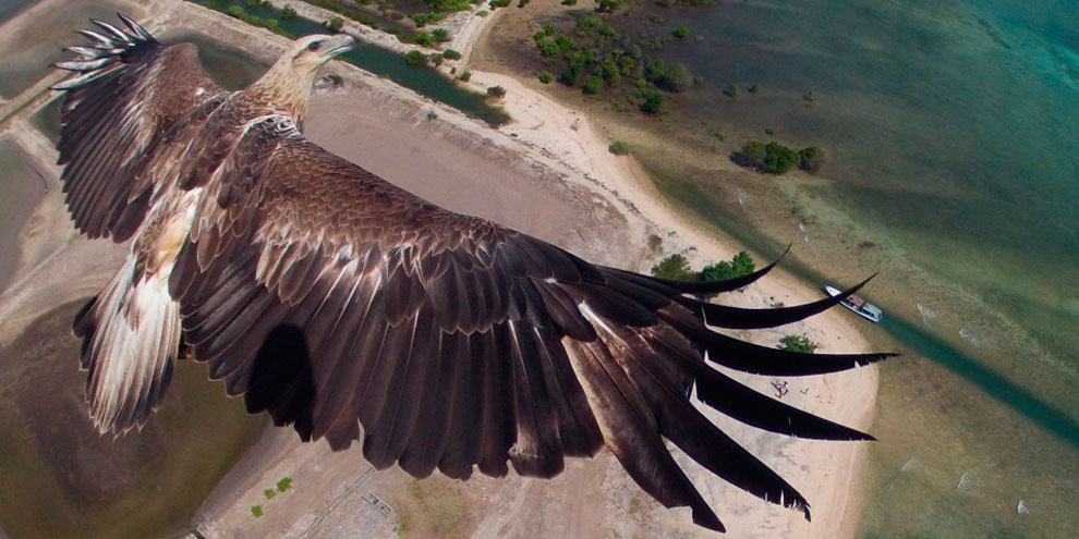 De que outra forma você acha que seria possível fotografar uma águia em pleno voo se não com um drone? Um helicóptero espantaria o bicho e ele jamais chegaria tão perto como é possível conferir na imagem a seguir. Note que a ave ainda dá uma encarada na câmera do drone.