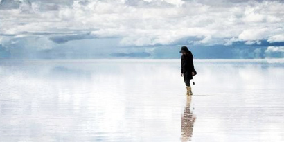 Esse gigantesco espelho de água se forma todos os anos no Salar Uyuni, localizado na Bolívia, quando as chuvas de verão formam uma fina camada de água sobre a superfície do local, confundindo o horizonte e o céu em uma paisagem totalmente surreal.