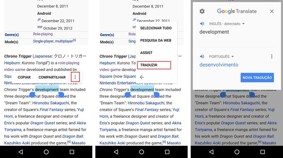 Felizmente, desde a sua versão 6.0 Marshmallow, o sistema operacional Android passou a ser integrado com o Google Tradutor, o que facilita muito a vida na hora de traduzir qualquer coisa em qualquer aplicativo. O procedimento é simples: selecione o texto em questão, e, na caixa de opções que surge, toque no ícone dos três pontinhos. No menu expandir, selecione a alternativa “Traduzir”.