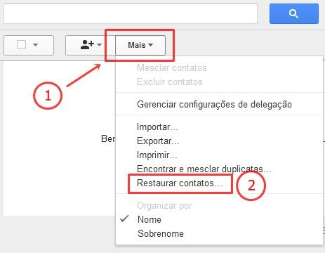 Feito isso, logo abaixo da barra de buscas, acione o botão “Mais” e depois “Restaurar contatos”. Dessa forma, uma janela será mostrada com algumas opções para determinar uma data para começar a restauração dos seus contatos.