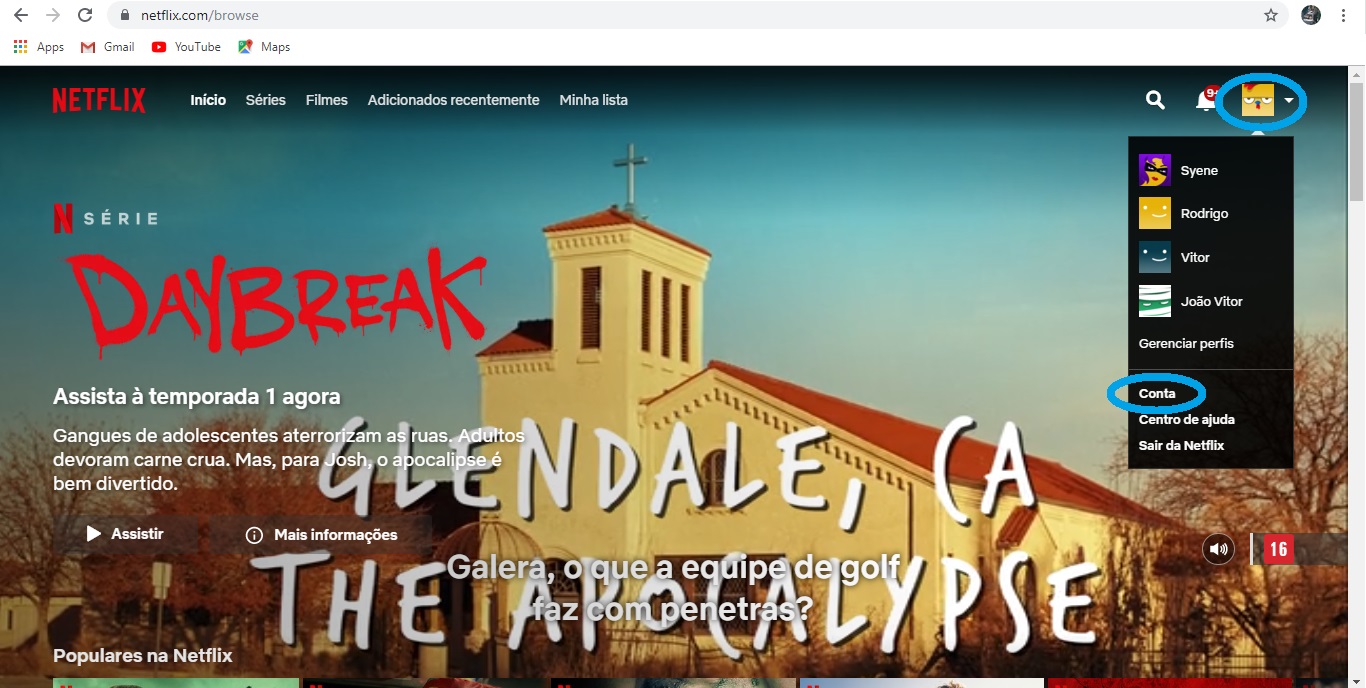 1. Ao acessar o site da Netflix e fazer o login, clique na imagem no canto superior direito e selecione, na aba exibida, o item "Conta".