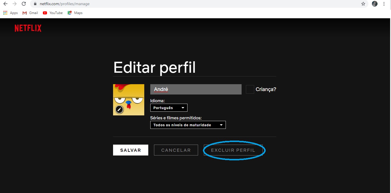 3. A Netflix redirecionará para uma tela de edição de perfil, na qual é possível fazer uma simples customização. Para apagar a conta de usuário, basta clicar em "Excluir perfil".