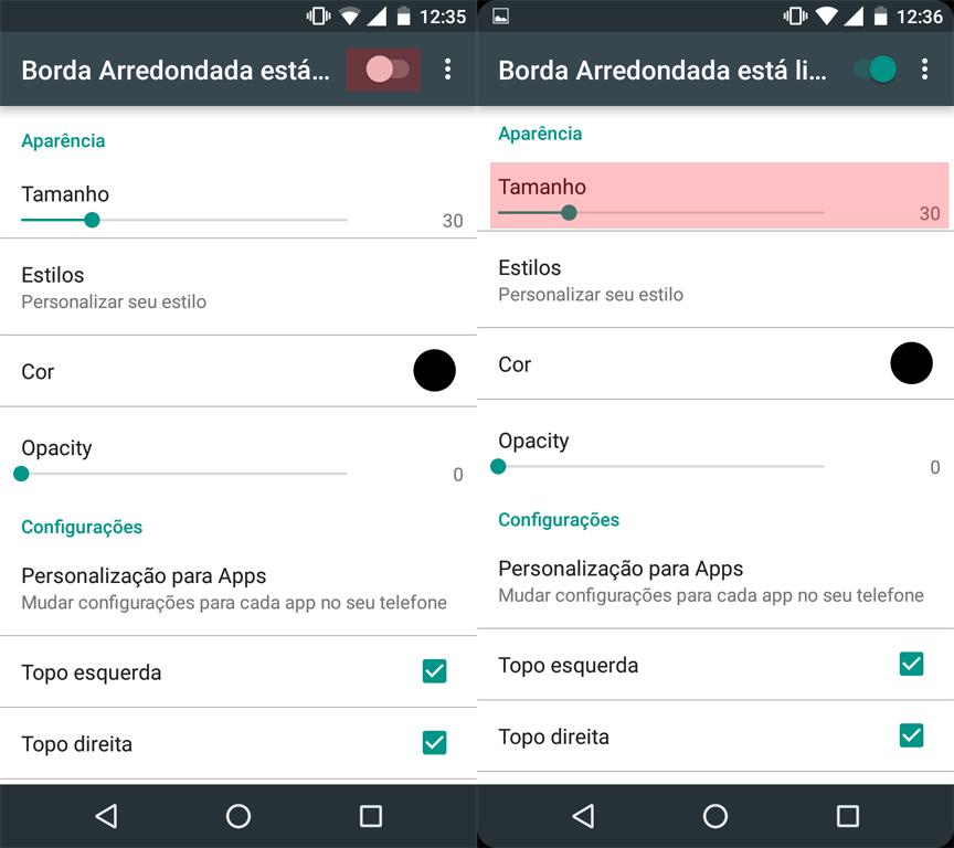 Passo 2. Logo abaixo, você vai ver várias opções de personalização. No item “Tamanho”, você pode modificar o tamanho da borda. O padrão do app é 30.