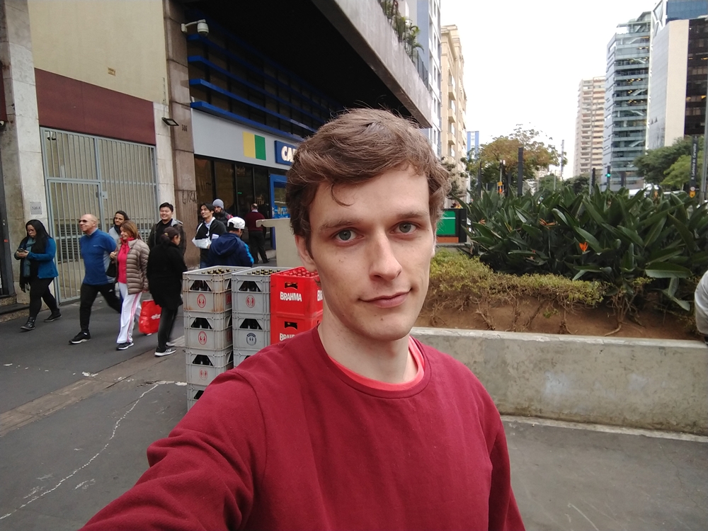 Seguindo para as câmeras, aqui fiquei ligeiramente decepcionado. Na traseira são dois sensores, um de 12 MP com abertura de f/1.7 e outro de 5 MP com abertura de f/2.2. Em ambientes bem iluminados, os resultados são bons, com um nível legal de detalhes e cores fiéis, mas não é algo que chegue perto dos resultados se aparelhos top de linha.