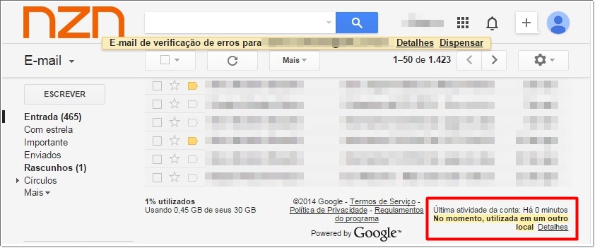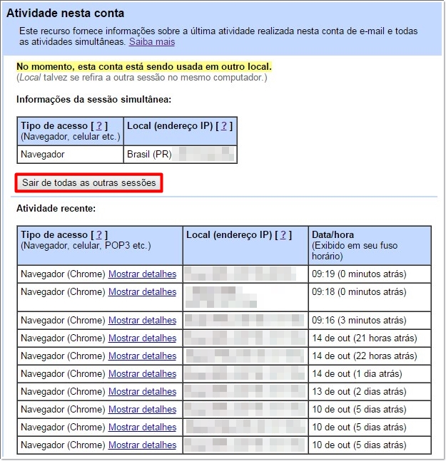 Acesse sua conta normalmente e então clique sobre a opção “Detalhes” localizada ao rodapé da página. Neste espaço, informações sobre a última atividade registrada em seu cadastro e o registro dos locais onde seu email foi aberto vão aparecer. Executada a ação, uma nova aba vai abrir; dados sobre o tipo de acesso, local, data e hora dos logins vão aparecer.