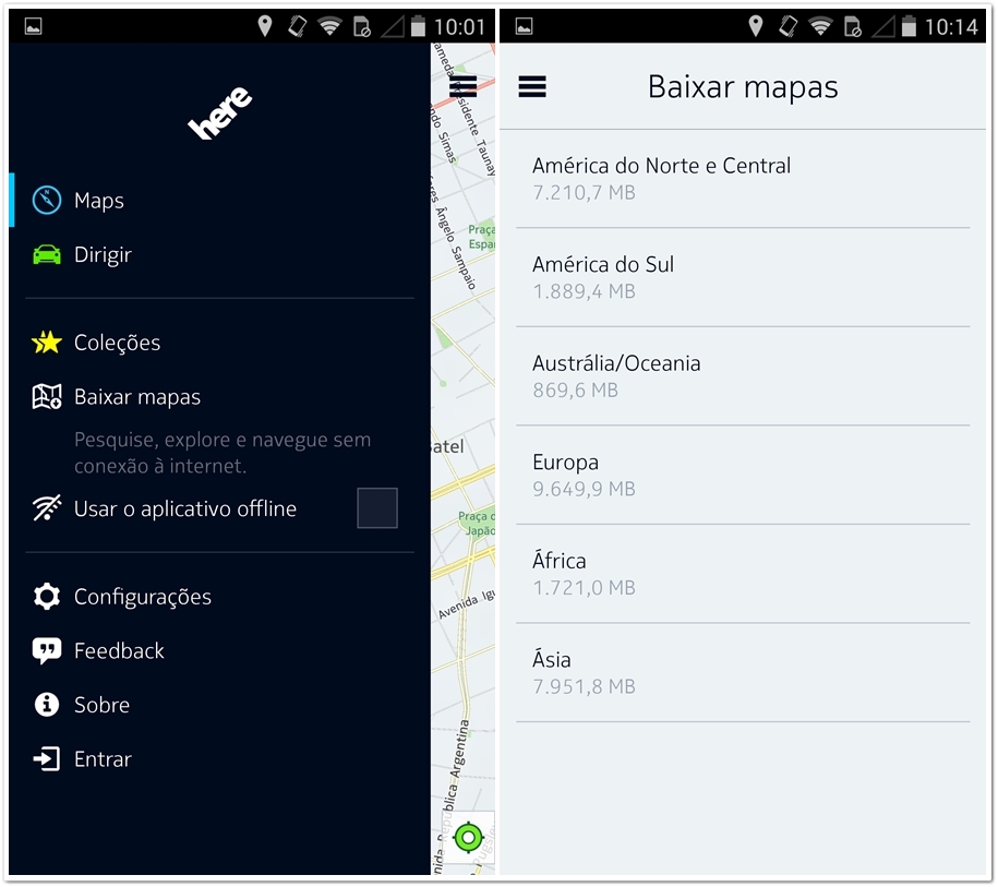 Mas o que realmente se destaca é o armazenamento de mapas para consulta offline. Mais de 100 países são abarcados por este recurso, e é possível selecionar um continente e uma região específica para o conseguinte download de todo o mapa. Veja como é fácil.