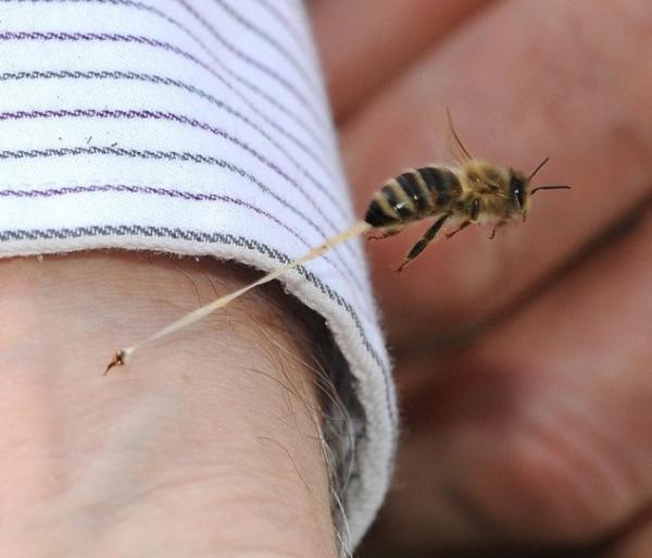 A imagem que você acabou de ver acima, registrada por Kathy Keatley Garvey, do Departamento de Entomologia da Universidade da Califórnia, registra o exato momento em que uma abelha pica uma pessoa e sai voando, deixando o seu ferrão e parte de seu abdome para trás.