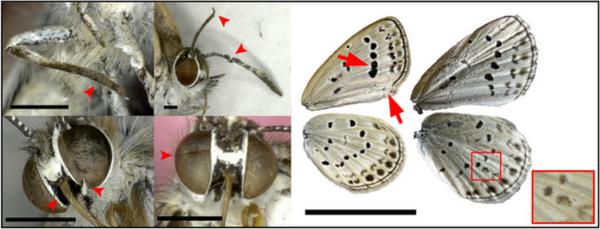Segundo a publicação, os cientistas encontraram borboletas com severas mutações, principalmente nas asas, sendo observadas anomalias na pigmentação e no tamanho. Outras alterações também foram encontradas em outros órgãos dos insetos, como malformação de antenas, olhos com desenvolvimento irregular e deformação no abdômen e patas.