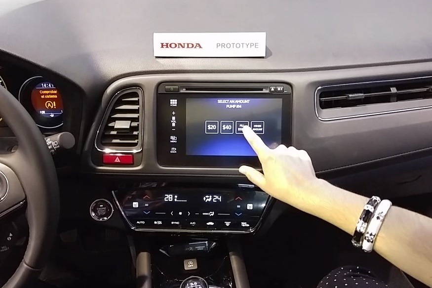 O painel do carro se conecta ao seu smartphone via Bluetooth e faz a ponte entre você e o sistema de pagamento do estabelecimento. Remotamente, eles enviam para o veículo a cobrança, e você autoriza o pagamento na tela sensível ao toque sem mexer no celular ou na carteira.