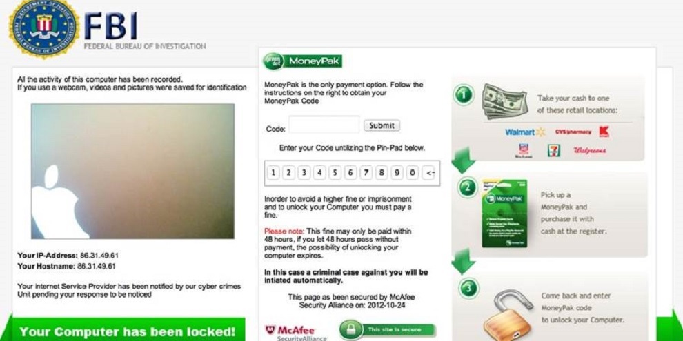 Com isso, um aviso surgia imediatamente na tela do computador. Tratava-se de um alerta falso do FBI e de outras agências de segurança que afirmava que o usuário havia cometido um crime ao acessar o site pornô e poderia pegar até três anos de prisão, a menos que pagasse naquele momento uma multa no valor de US$ 200 (quase R$ 800).
