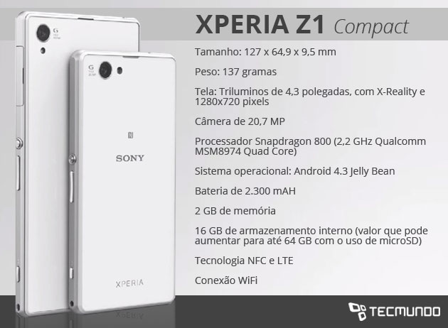 Veja a seguir as especificações técnicas do Xperia Z1 Compact: