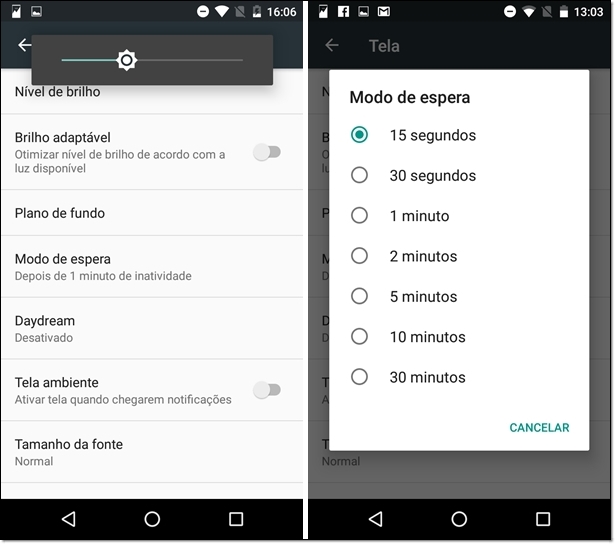 A diminuição do brilho da tela e do tempo de iluminação do visor é uma das soluções mais eficientes e populares no quesito economia de energia. Para ajustar essas preferências, acesse a opção “Configurar”, role para baixo e clique em “Tela”.