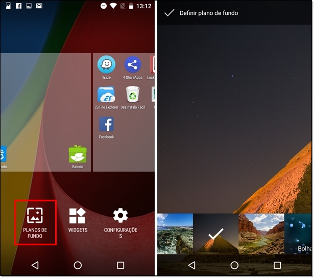 Pressione o plano de fundo e selecione a opção “Planos de fundo”. Depois, navegue pela sua galeria de imagens ou escolha uma das opções exibidas pelo próprio Android em busca de um background escuro.