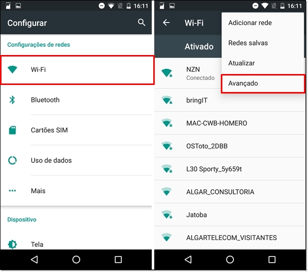 Nota: esses ajustes podem ser consultados também a partir da tela de notificações rápidas: mantenha o cabeçalho do celular pressionado e arraste a aba para baixo. Em seguida, selecione os ícones correspondentes às opções de WiFi e Bluetooth.