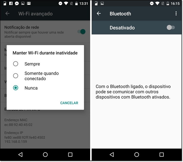 Em “Manter Wi-Fi durante inatividade”, três ações para a definição do serviço poderão ser escolhidas (“Sempre”, “Somente quando conectado” ou “Nunca”). Ainda nessa tela, as notificações de rede podem ser ou não exibidas – basta tocar sobre a chave seletora em “Notificação de rede” e pronto.