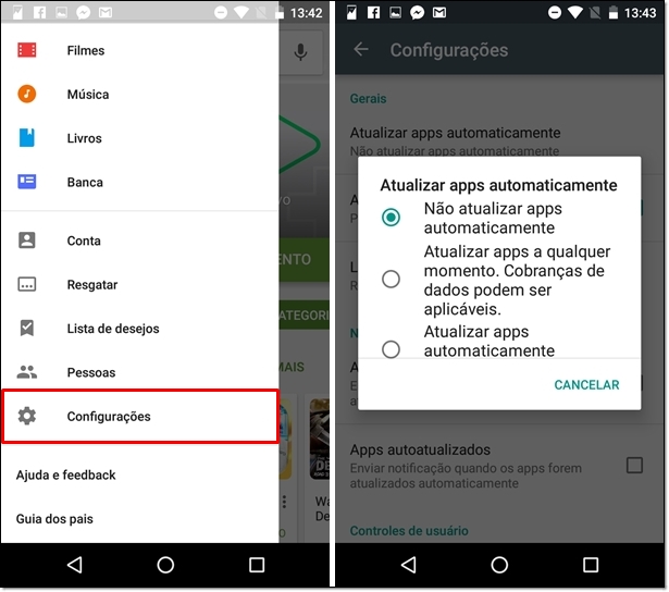 Role a página para baixo e abra a opção “Configurações”. Em “Atualizar apps automaticamente”, selecione a ação “Não atualizar apps automaticamente”. Feito isso, todos os updates terão então de ser baixados manualmente.