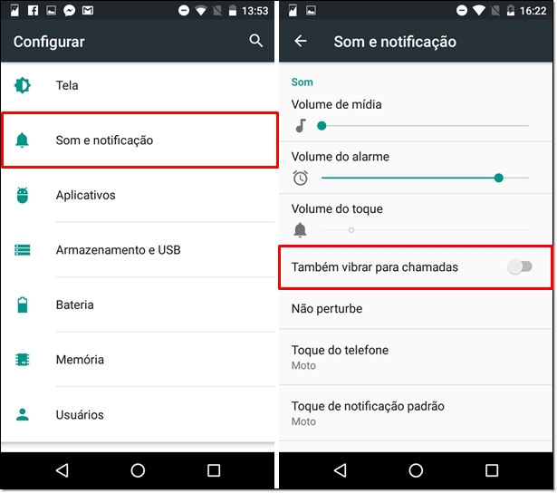 Para desativar as notificações por vibração, acesse a opção “Som e notificação” e toque sobre a chave seletora “Também vibrar para chamadas”.