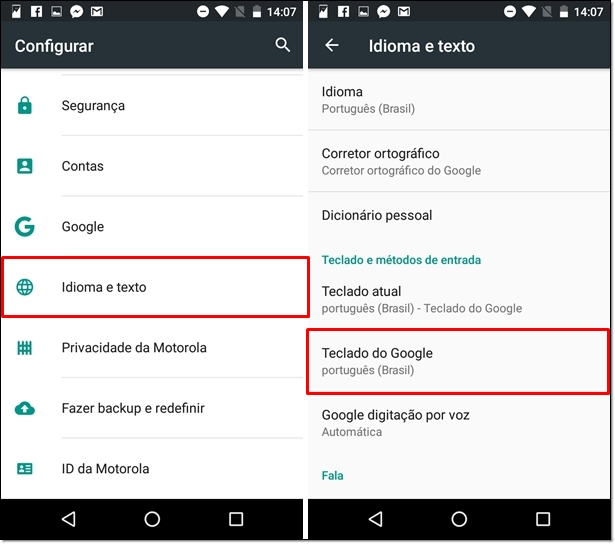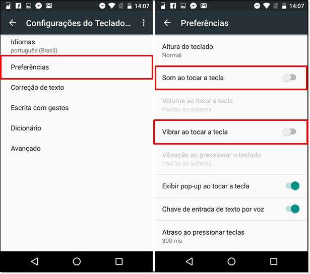 Se você deseja desativar a emissão de vibrações durante o uso do teclado, volte à tela de “Configurar” e abra a opção “Idioma e texto”. Em seguida, clique em “Teclado do Google – português (Brasil)”, abra as “Preferências” e desative a chave “Vibrar ao tocar a tela” e “Som ao tocar a tela”.