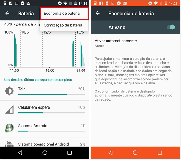 Ainda em “Bateria”, o modo-padrão de economia do Android 6.0 Marshmallow pode ser ativado. Clique sobre os três pontos exibidos à direita do cabeçalho e selecione a opção “Economia de bateria”. Na tela aberta, toque sobre a chave seletora e então ative o recurso.