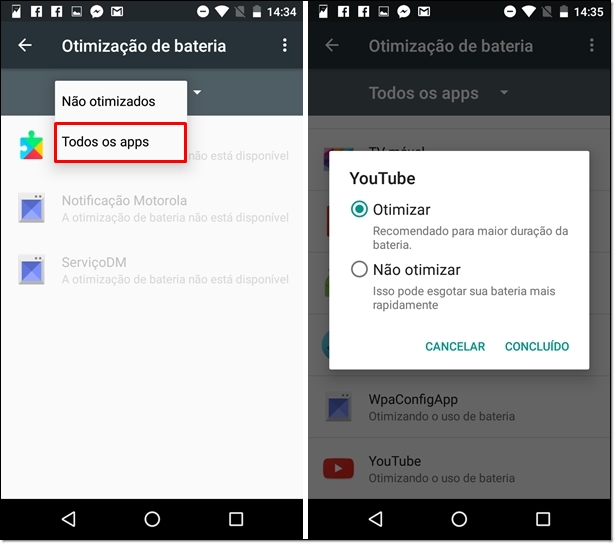 A otimização do uso de energia por parte dos apps pode ser feita também a partir das opções de “Bateria” (imagem acima). Clique novamente sobre os três pontos, à direita do cabeçalho, e, agora, abra a “Otimização de bateria”. Em “Não otimizados”, selecione “Todos os apps” e aguarde o carregamento da lista que exibe todos os serviços instalados.