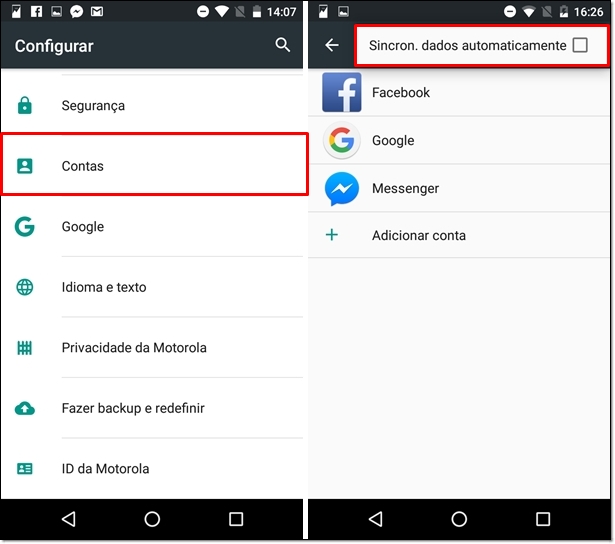 Para economizar ainda mais bateria, a sincronização de dados entre as contas de usuário pode ser encerrada. Para isso, abra a opção “Configurar” e então toque em “Contas”.