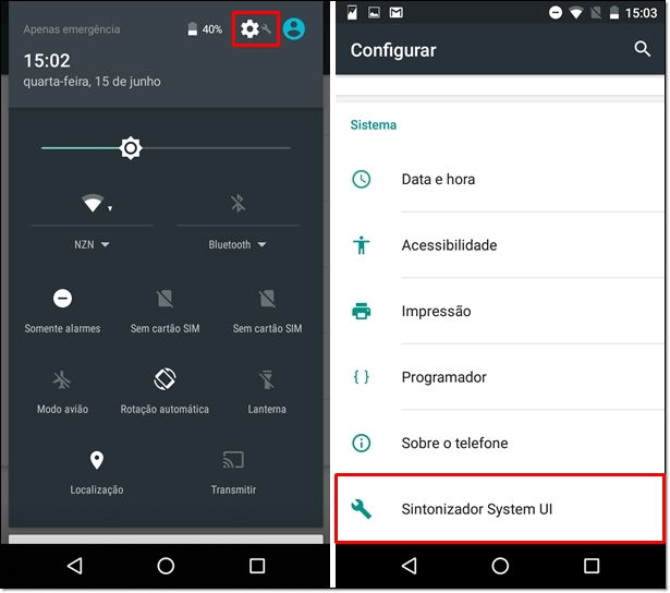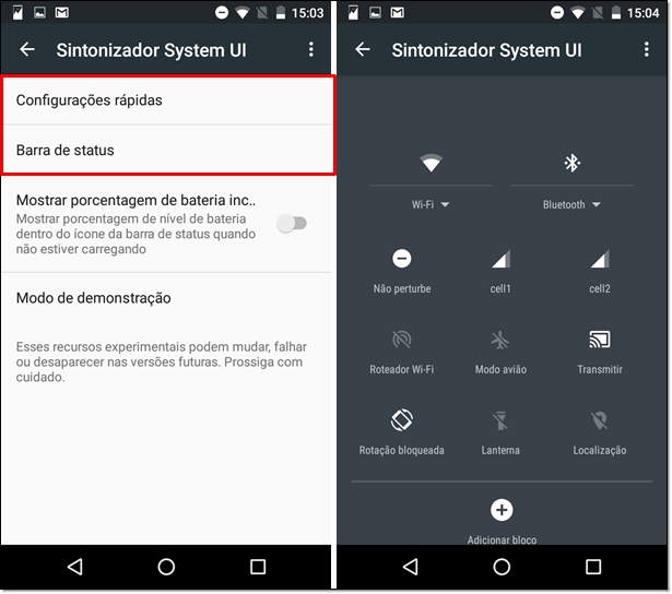 Agora, retorne à tela iniciar e toque em “Configurar”: role a página para baixo e abra o “Sintonizador System UI”. Selecione em “Barra de status” os serviços que deverão ser listados pela barra de notificações rápidas ou gerencie manualmente a disposição dos apps em “Configurações rápidas” – basta tocar e segurar os ícones não apenas para reposicioná-los, mas também para adicionar ou remover funções (use os símbolos de “+” e “-” para executar os respectivos comandos).