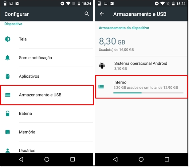 Em “Configurar”, abra a opção “Armazenamento USB”. Em seguida, clique em “Interno” e role a página para baixo até que o campo “Explorar” seja exibido e navegue, por fim, pelas pastas do seu Android.