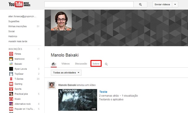 Acesse o canal (perfil) do indivíduo em questão e selecione “Sobre”.