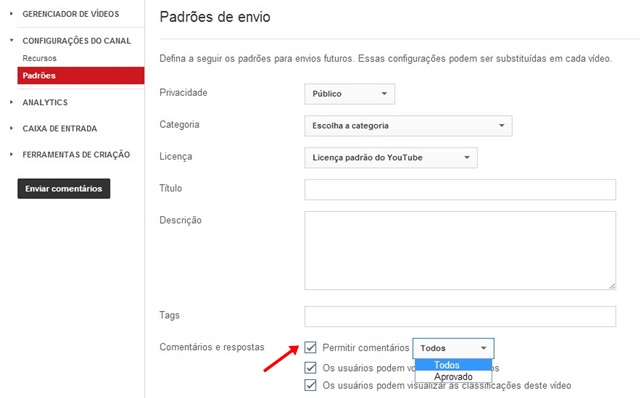 As opções presentes aqui permitem as configurações de envio, significando que todo vídeo postado posteriormente seguirá esses padrões. Logo, ao impedir o envio de comentários ou submetê-los a aprovação, todo vídeo ficará assim.