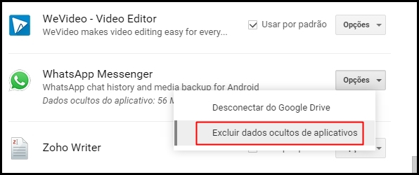 Caso queira apagar esses dados e liberar espaço de armazenamento de seu servidor na nuvem, clique na pequena setinha ao lado do botão “Opções” relativo ao WhatsApp Messenger. No menu que se abre, clique em “Excluir dados ocultos de aplicativos”, e os backups serão eliminados instantaneamente. Atenção: pense bem antes de realizar este procedimento, já que ele não pode ser desfeito. Uma vez deletados, os backups não podem mais ser recuperados.