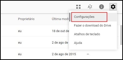 Primeiramente, acesse a versão web do Google Drive (http://www.drive.google.com) e faça login usando as mesmas credenciais que você informou ao ativar o backup na nuvem do WhatsApp. Em seguida, clique no botão “Configurações” (localizado no canto superior direito da tela, com um ícone no formato de uma engrenagem) e selecione a opção homônima no menu que se abre.
