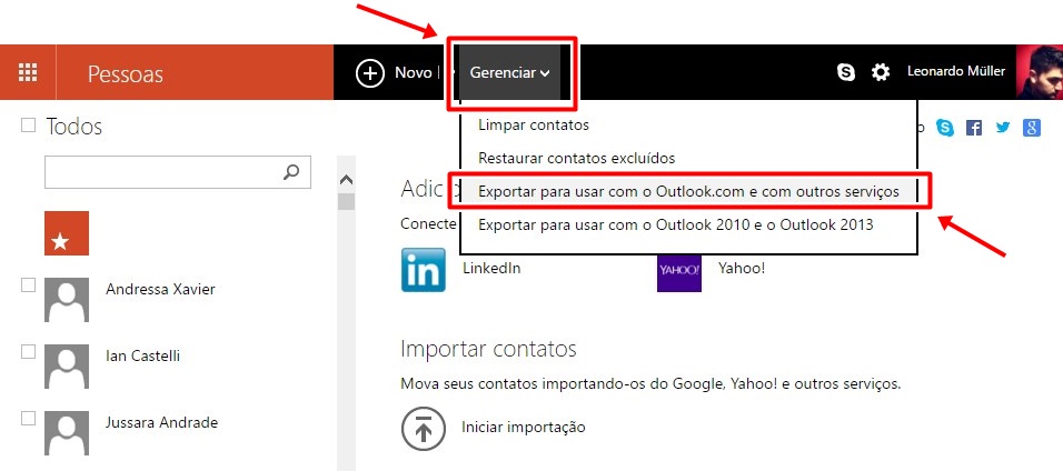 Agora, confira a barra de título da página e clique em “Gerenciar”. Escolha a opção “Exportar para usar com o Outlook.com e com outros serviços”.