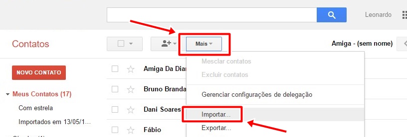 Depois de estar na página inicial dos seus contatos, vá em “Mais”, no topo da página, escolha “Importar” e clique em “Escolher Arquivo”.