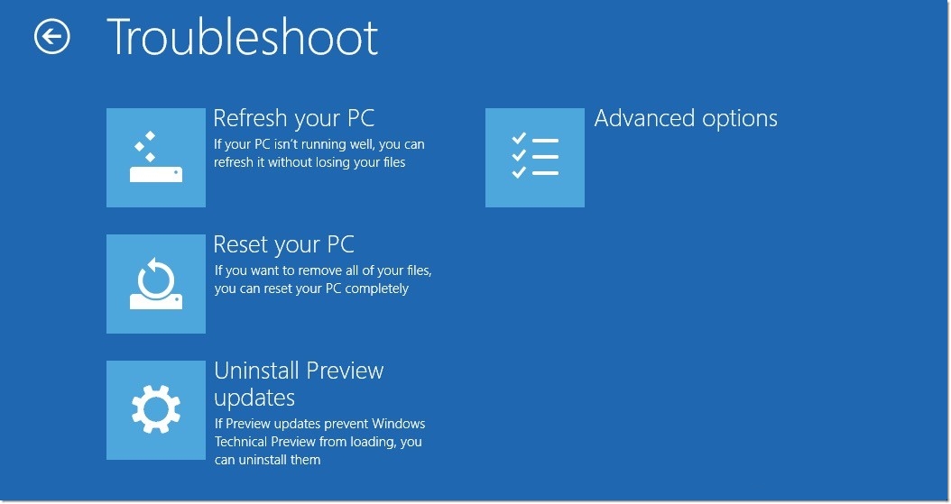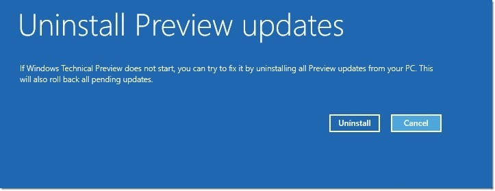 Acesse o Menu Iniciar, clique sobre a opção “Desligar” e segure a tecla “Shift”. Em seguida, três opções serão exibidas. Selecione o quadro “Solucionar Problemas” e, então, clique sobre a aba “Desinstalar Preview updates” – esta opção fará com que a atualização que provê acesso ao sistema de testes da Microsoft seja removida de seu computador.