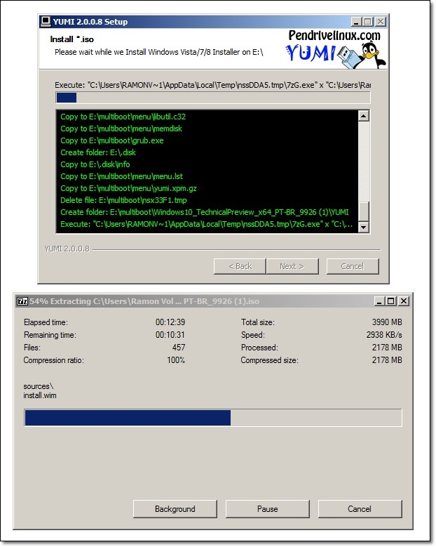 Importante mencionar que este processo é lento – durante nossos testes, cerca de meia hora foi consumida por esta etapa. Note que duas janelas de renderização vão ficar ativas. Aguarde pela conclusão da operação e finalize este passo em “Finish”. Pronto! Seu pendrive bootável foi concluído; para instalar o Windows 10 em versão prévia, mais nenhum download vai precisar ser feito.