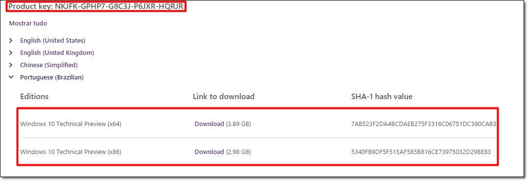 Clique aqui para acessar o portal do Windows, selecione a linguagem “Portuguese (Brazilian)” e escolha a versão do sistema adequada para o seu computador. Note que, abaixo do campo “Download Link”, a chave de ativação do produto fica à mostra (imagem acima).